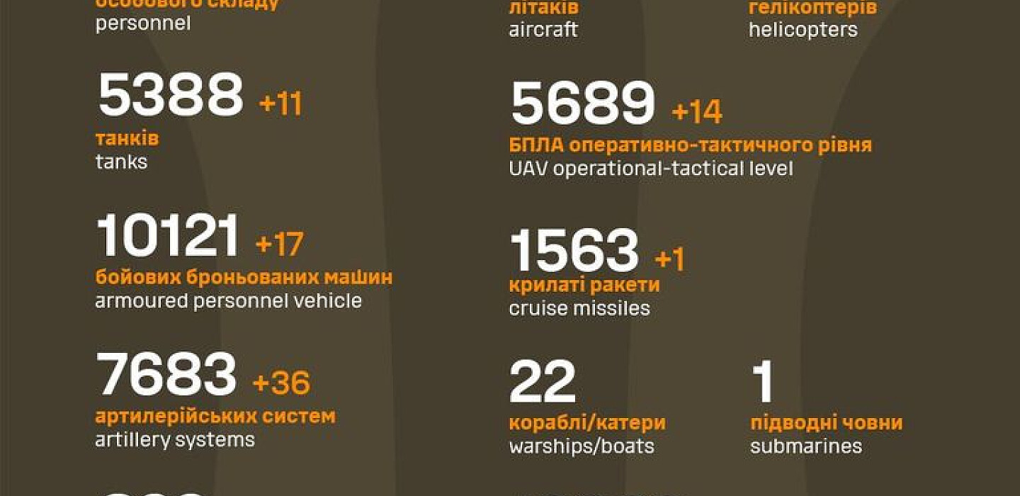 As of November 16, 2023, the Armed Forces of Ukraine killed 1130 Russian invaders and destroyed 11 tanks, 17 APVs, and 36 artillery systems of the enemy, according to the General Staff of the Armed Forces of Ukraine.