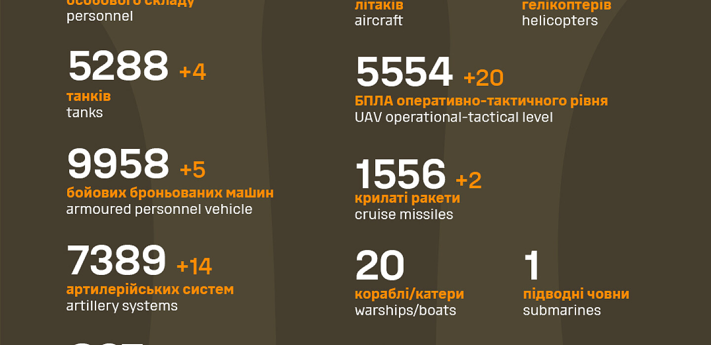As of November 6, 2023, the Armed Forces of Ukraine killed 880 Russian invaders and destroyed 4 tanks, 5 APVs, and 14 artillery systems of the enemy, according to the General Staff of the Armed Forces of Ukraine.