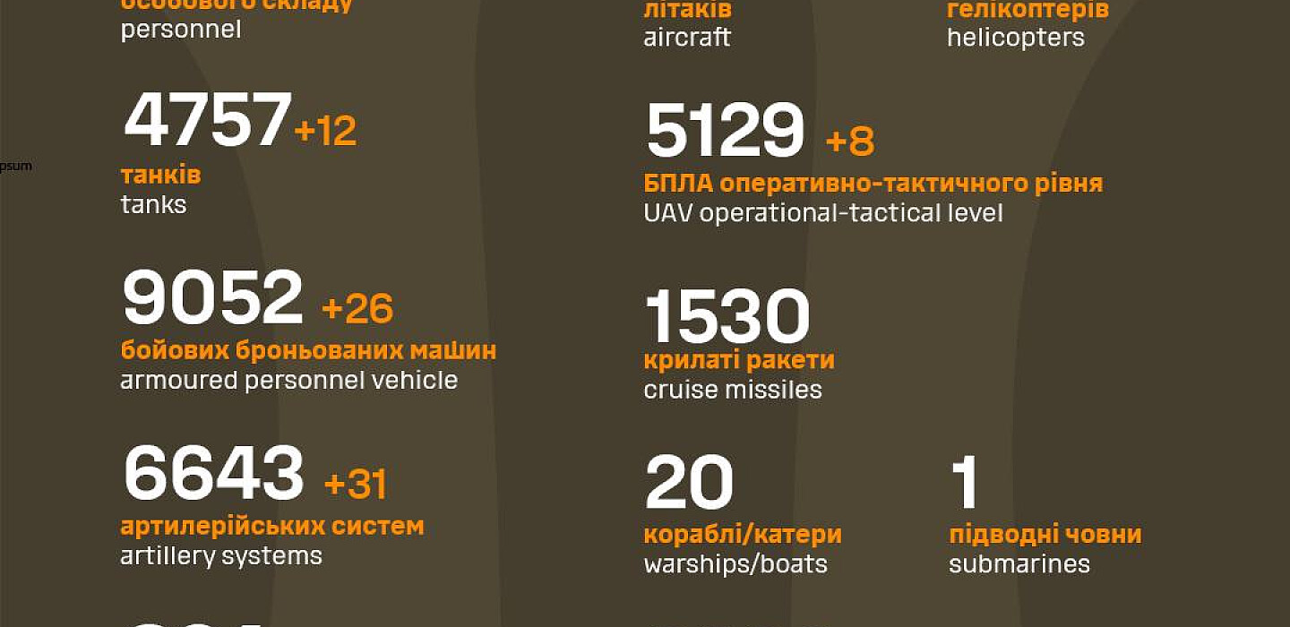 As of October 5, 2023, the Armed Forces of Ukraine killed 580 Russian invaders and destroyed 12 tanks, 26 APVs, and 31 artillery systems of the enemy, according to the General Staff of the Armed Forces of Ukraine.
